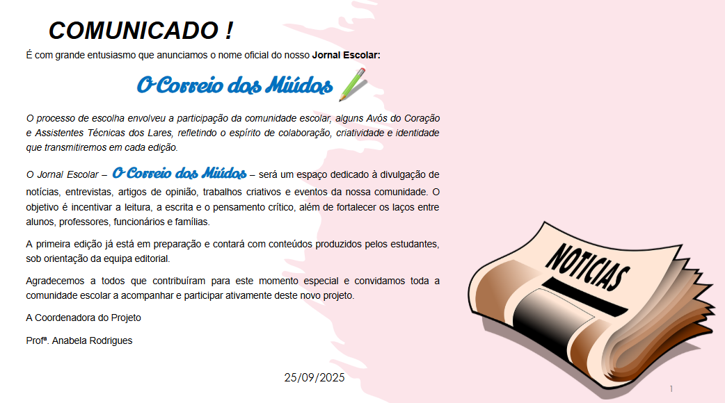 Continuamos a caminhar com dedicação, persistência e cooperação. Juntas, enfrentaremos os desafios que surgirem, trabalhando em equipa para construir uma escola cada vez mais inclusiva, inovadora e promotora de valores cívicos e sociais.(junho de 2025)