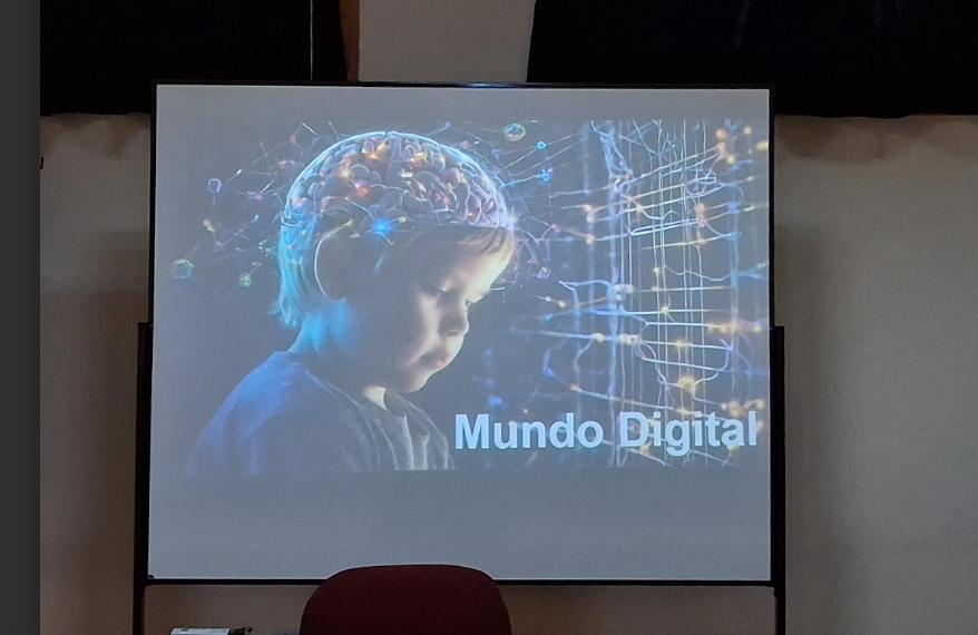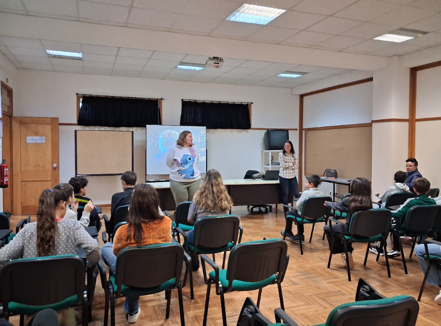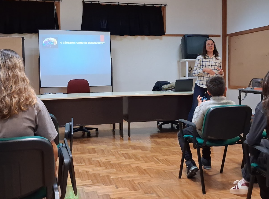 As enfermeiras da Saúde Escolar, Diana e Cristina, dinamizaram uma sessão dedicada ao mundo digital e ao impacto que o uso excessivo de ecrãs pode ter no cérebro, na saúde física e no bem‑estar mental das crianças e jovens.