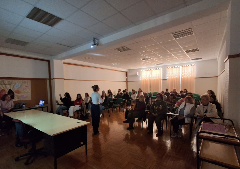 As assistentes sociais Mariana Romana e Joana Gonçalves, técnicas responsáveis pelo projeto, apresentaram-se aos alunos e explicaram o propósito da sessão e o trabalho que estão a desenvolver. A atividade, intitulada “Alegra‑me a Partilha”, insere‑se no Eixo 3, direcionado para a população envelhecida. A sessão decorreu durante uma aula de TIC, na qual alunos e mulheres reformadas trabalharam em conjunto na realização de pesquisas sobre o tema cancro, produzindo frases e conteúdos informativos destinados a uma futura exposição, assinalando assim o Dia Mundial contra o Cancro, celebrado a 4 de fevereiro. O encontro permitiu desenvolver literacia digital, promover a reflexão sobre questões de saúde e criar um espaço de aprendizagem colaborativa.